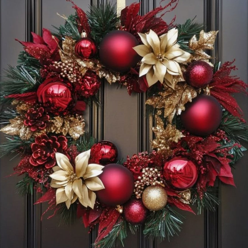 Complete your holiday entrance with our handcrafted door wreath — a timeless piece that adds warmth and elegance to your main décor package. Each wreath is beautifully arranged with lush greenery, ornaments, and festive accents, creating a stunning focal point for your front door.